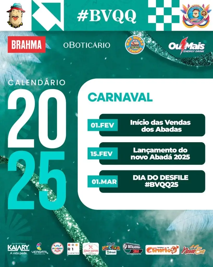 A Banda do Vai Quem Quer divulgou o calendário oficial do Carnaval 2026 em Porto Velho, marcando o início das atividades para o dia 14 de janeiro, com abertura da sede, apresentação de novos bonecos gigantes e início da venda promocional de abadás. O cronograma segue com o Adesivaço BVQQ no dia 17, ações ambientais com distribuição de mudas no dia 22 e a apresentação do abadá e do tema do desfile, em 31 de janeiro, que neste ano homenageia “As Jades”.
