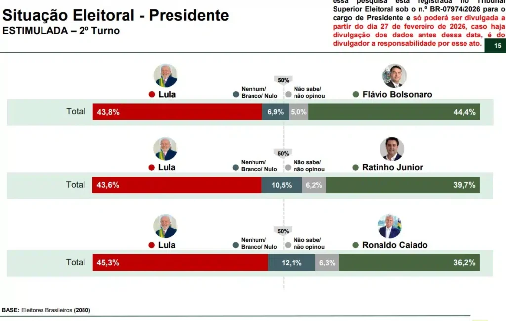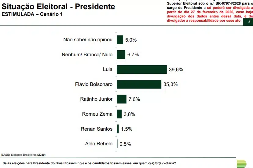 Nos cenários estimulados de primeiro turno, Lula registra 39,6% contra 35,3% de Flávio em uma simulação, e 40,5% a 36,6% em outra. Na projeção de segundo turno, o senador marca 44,4% ante 43,8% do presidente. Em janeiro, Lula aparecia com 44,8% contra 42,2%.