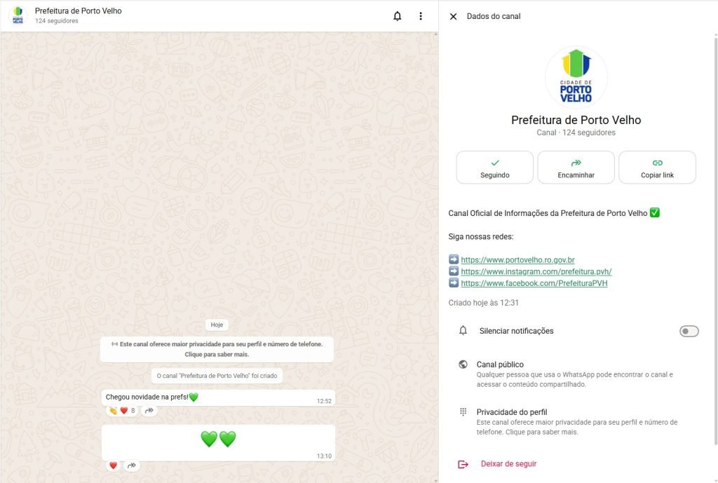A Prefeitura de Porto Velho criou um canal oficial no WhatsApp para ampliar a comunicação direta com os cidadãos. Administrada pela Secretaria Municipal de Comunicação, a ferramenta reúne notícias, serviços, agenda institucional e comunicados de interesse coletivo em um único espaço, com publicações verificadas e acesso voluntário, sem comentários ou debates.